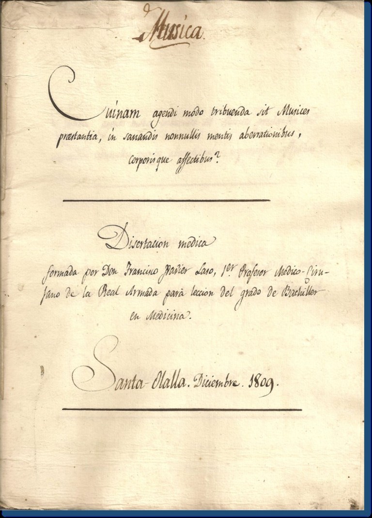1 diciembre, 201921 marzo, 2020La “Disertación” para el Grado de Bachiller en Medicina de Francisco Javier Laso: un manuscrito inédito para la historia de la musicoterapia Continue reading "La “Disertación” para el Grado de Bachiller en Medicina de Francisco Javier Laso: un manuscrito inédito para la historia de la musicoterapia"