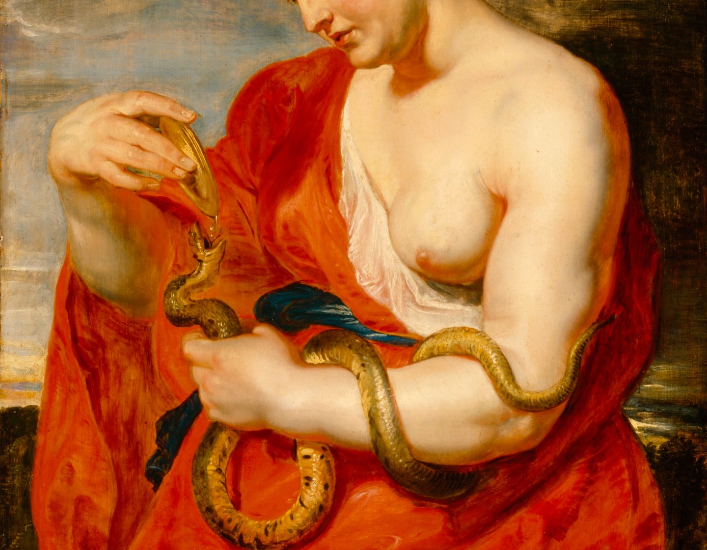 Este cuadro -en mi modesta opinión- es uno de los menos conocidos, pero no por eso menos bello, de Rubens. El pintor, excelente conocedor de la mitología clásica, y siempre fiel a su particular estilo, nos muestra aquí esplendorosa a la diosa de la salud representada con la serpiente, símbolo ancestral de la medicina.(1) Como dicen los autores del libro El médico de familia en el arte: