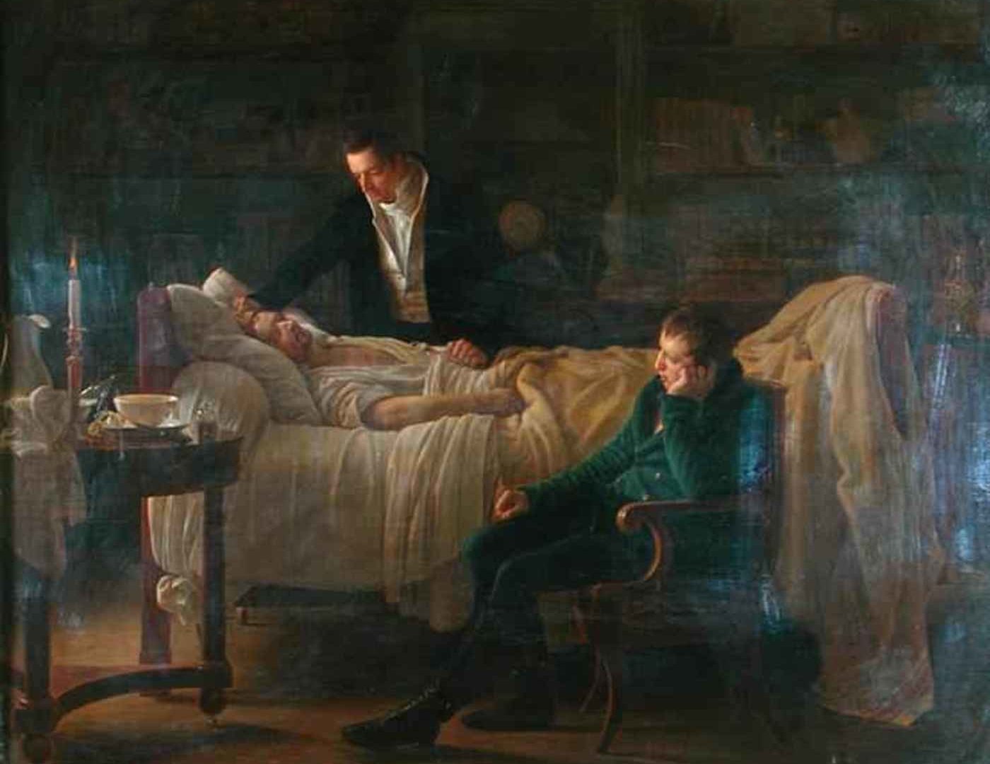 Louis Hersent (1777-1860), un pintor que destacó, sobre todo, en tiempos de la Restauración francesa, representó la muerte de Bichat en el cuadro que ilustra estas páginas, y que se encuentra en el Museo de Historia de la Medicina de la Facultad de Medicina de la Universidad París V, René Descartes. A la tenue luz de una vela situada sobre una mesa auxiliar –en la que también hay una jarra para el agua, algunos paños, un bol para el ligero alimento que se le ha querido dar y un frasco de jarabe, un calmante, quizás, o un antipirético- en el centro de una gran habitación que, más que un dormitorio, parece una biblioteca por las enormes estanterías repletas de libros que aparecen al fondo, vemos a Bichat encendido por la fiebre, sudoroso, demacrado, agonizando en la cama. Bichat no tenía familia, había entregado su vida entera a la medicina. Le acompañan, sólo, dos de sus discípulos, que eran a la vez sus amigos, los doctores Pierre Jean Baptiste Esparron (1776-1818), del que sólo sabemos que, en 1803, publicó un Essai sur les ages de l’homme, y el más conocido Philibert Joseph Roux (1780-1854), considerado como uno de los pioneros de la cirugía plástica. Uno le toma la mano, con afecto, mientras le aplica un lienzo en la frente para enjugar el sudor o aliviar el dolor. El otro le observa apesadumbrado.
